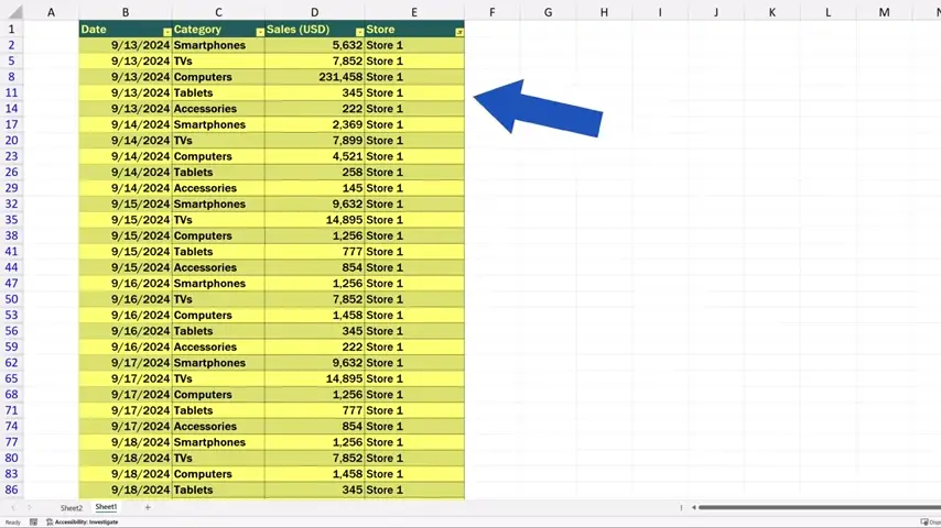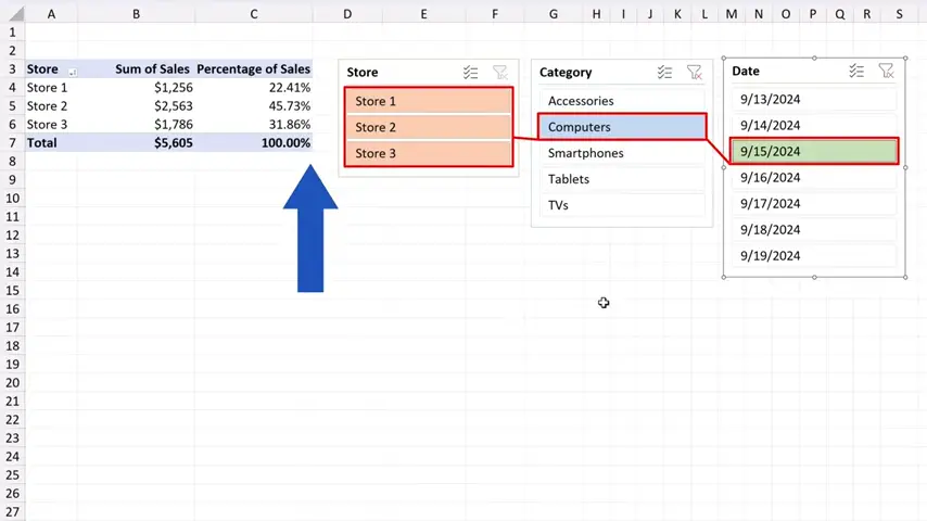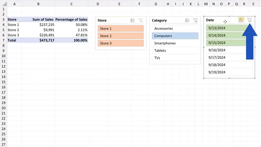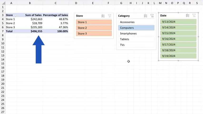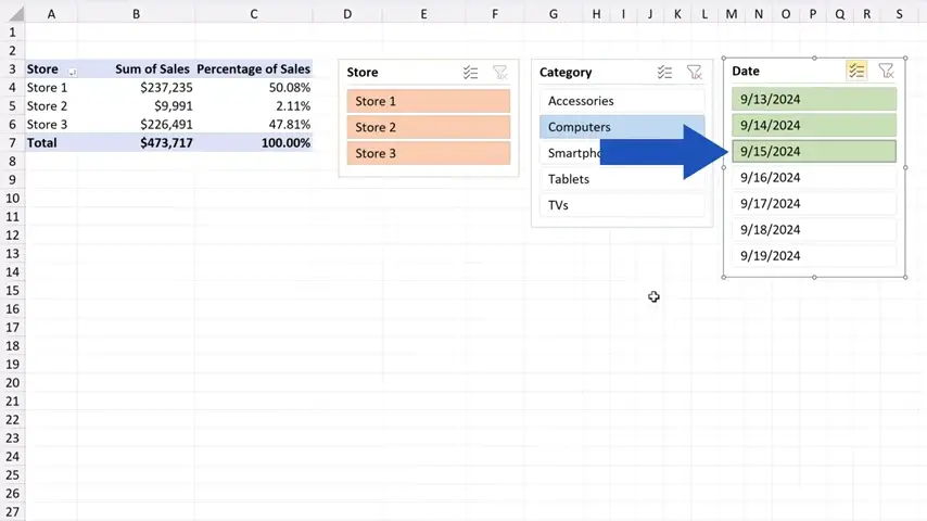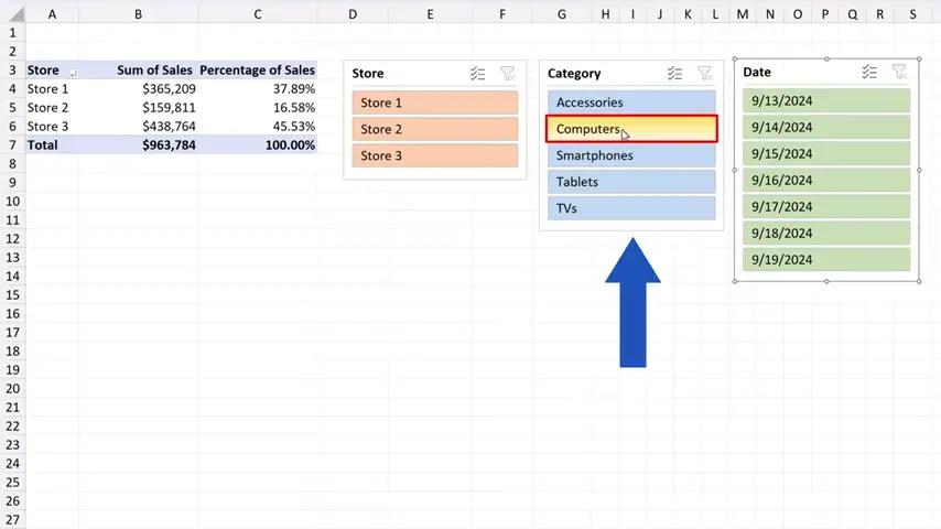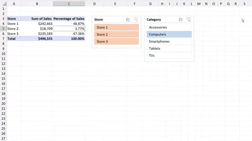 To filter the Computers sales data, we simply click on ‘Computers’ in the slicer ‘Category’. We can immediately see the sales figures in ‘Computers’ for all three stores.