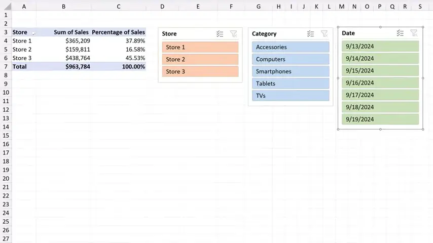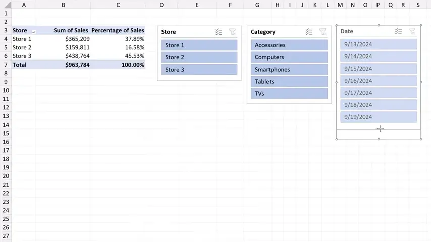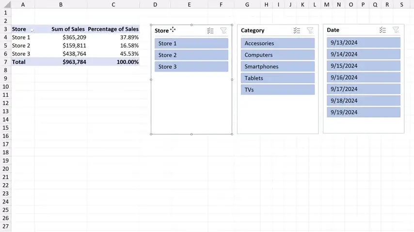 Each slicer can be moved around and set anywhere within the sheet. Simply, click on the slicer header and drag and drop it wherever needed. Here, for example, we arrange the slicers in this order.
