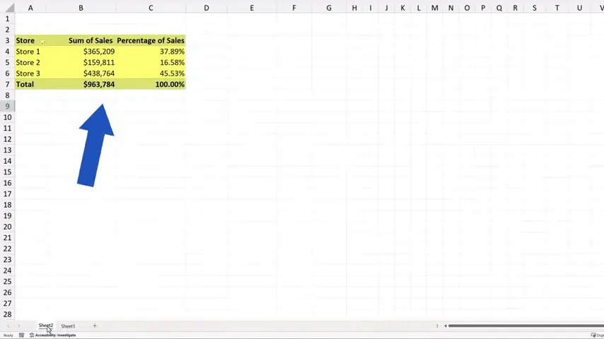 We can also insert a slicer when working with a pivot table in a simple way. Let’s click into Sheet2 now where we can see the prepared pivot table.