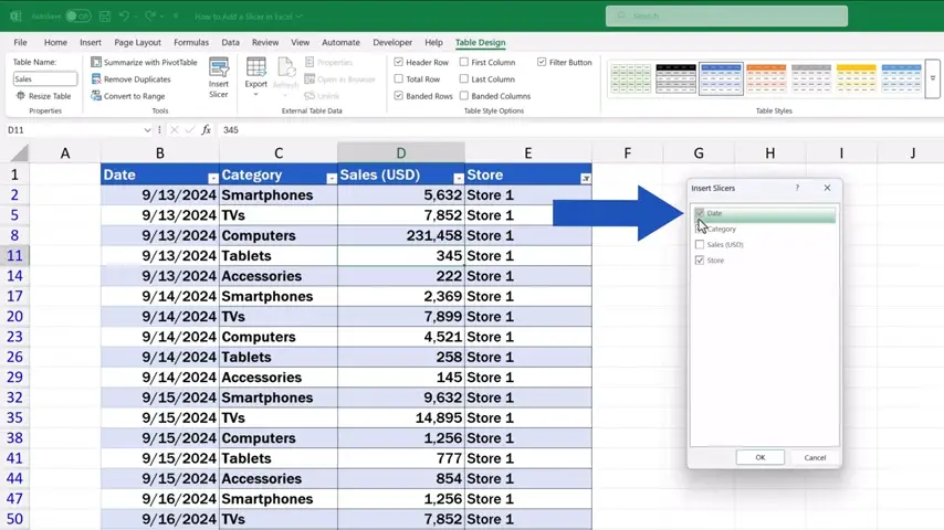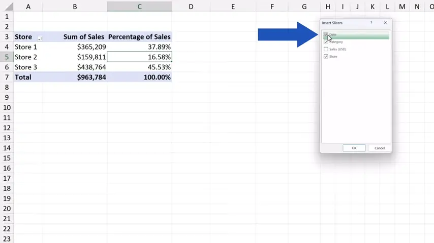 For instance, we can select ‘Store’, ‘Category’, and ‘Date’. After we confirm with ‘OK’.