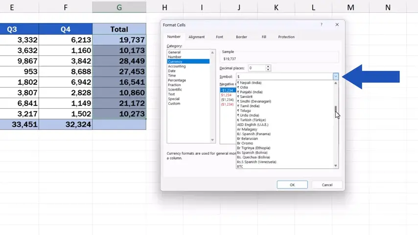 On the right, we can select the currency symbol we need. There’s a really huge list of currencies from all over the world available in the drop-down list. We can even find Bitcoin among them.