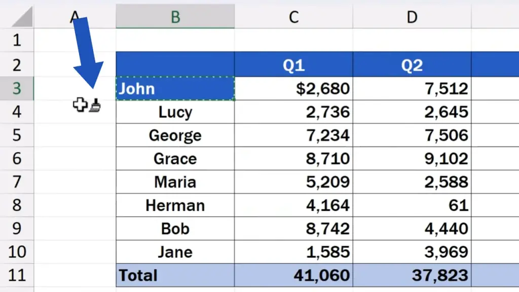 Let’s say we want to copy the formatting of the cell B3, which is the blue background, white font, text aligned left, and we want the whole column B looking like this. We want to apply the same formatting to this list of names.
