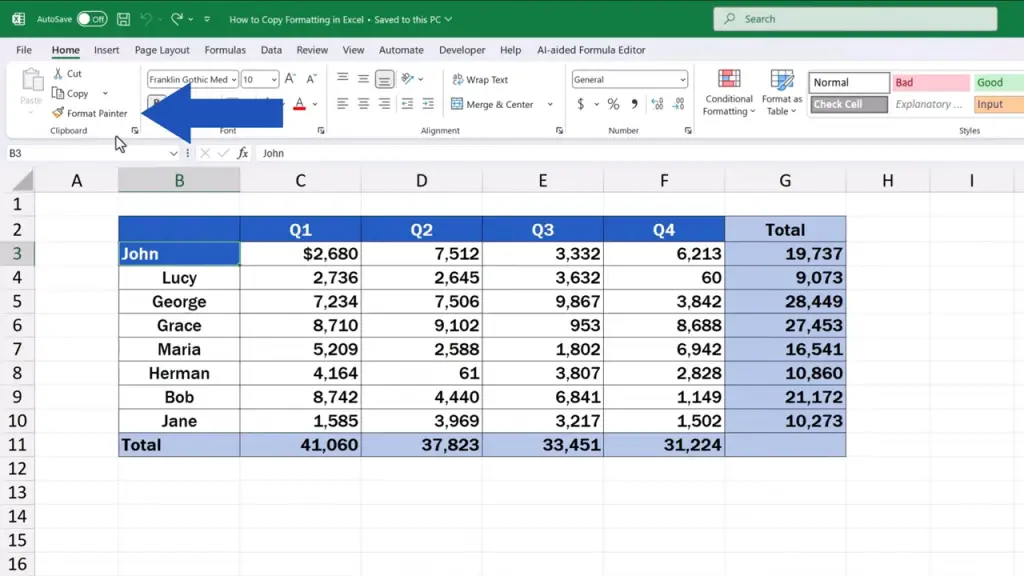 We just select the cell with the desired formatting, so we click on B3 again, then we click on Format Painter to see the paintbrush icon, and the following step will be slightly different.