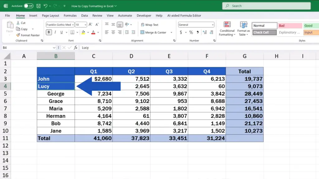 If we want to apply the formatting to one cell only, we simply click on the target cell and that’s all it takes. We click on B4 and it’s now been formatted like B3.