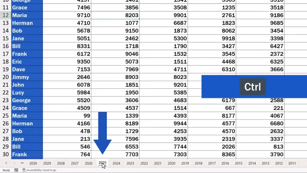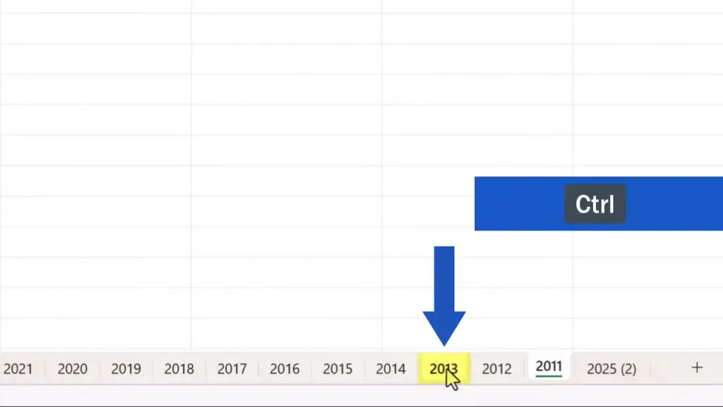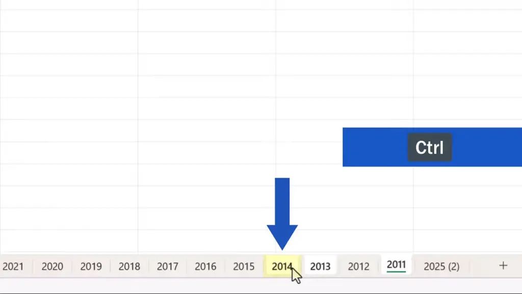 Then we press and hold the Control key again, and we select the rest of the sheets that need to be copied. For example, we’ll select ‘2013’ and ‘2014’.