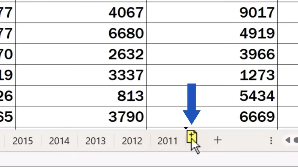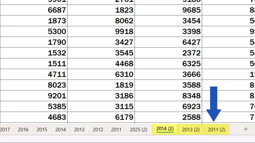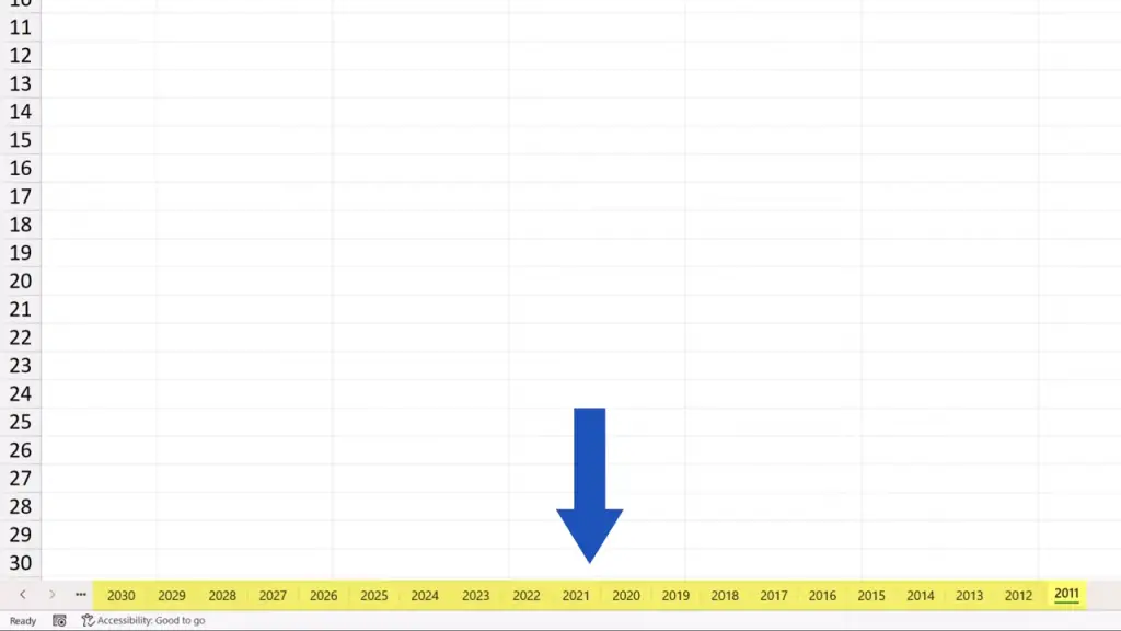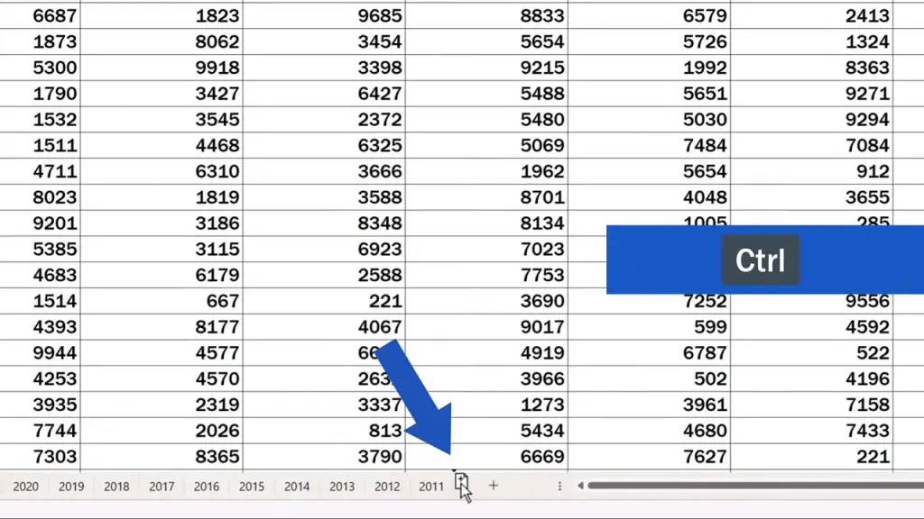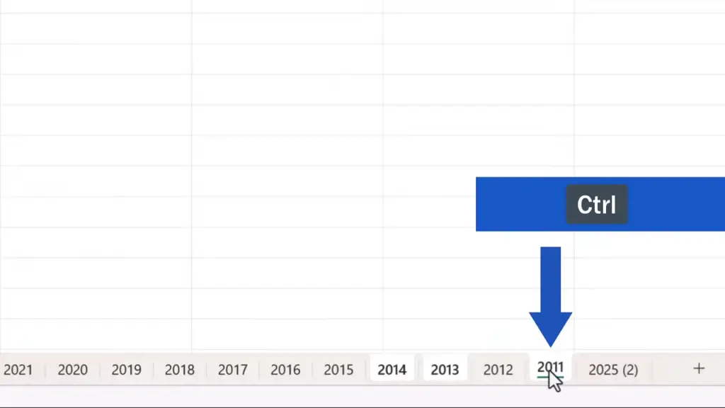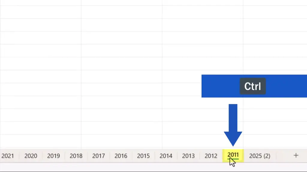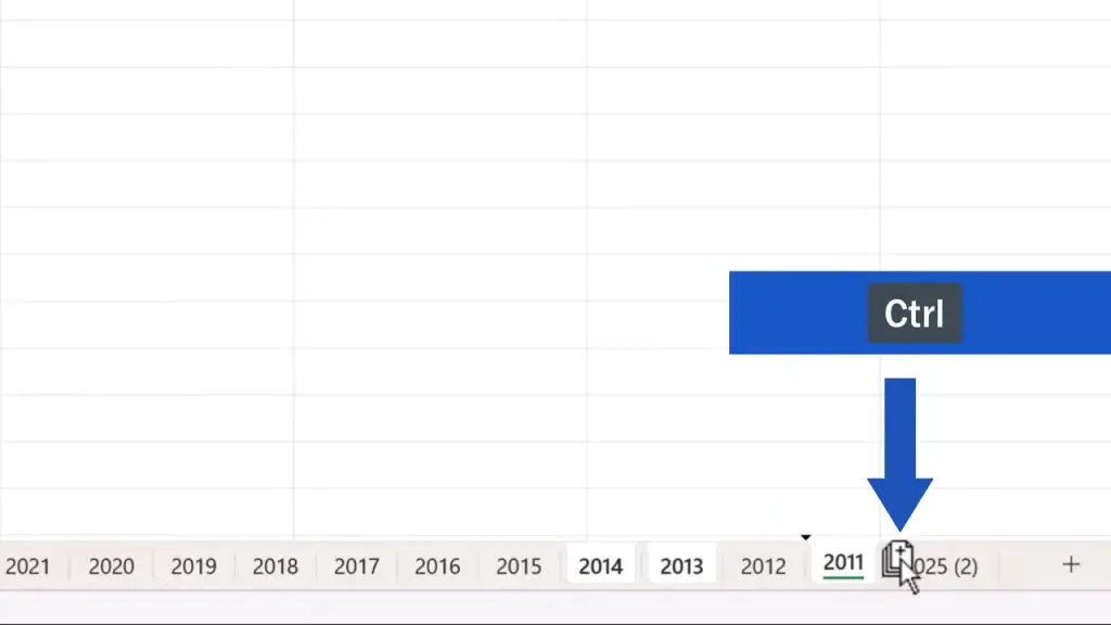 We can use the same way to quickly and conveniently copy multiple sheets at once. Again, we click on the first sheet we want to copy, here it’ll be let’s say the sheet ‘2011’.