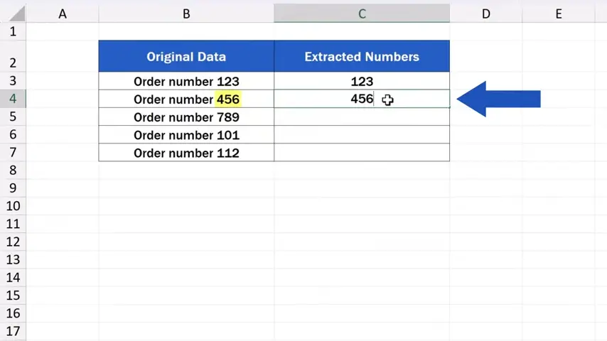 So, here we click in the cell C4 and additionally enter ‘456’. This way we provided two examples of what to extract.