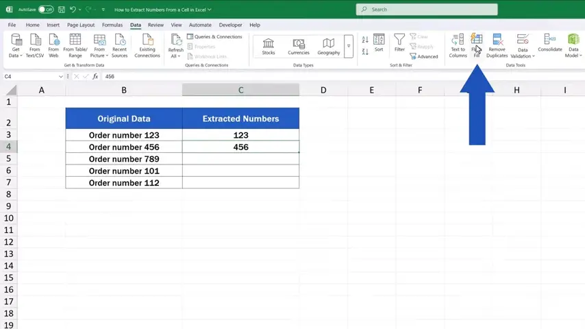 Find the section ‘Data Tools’ and look for the ‘Flash Fill’ button.
