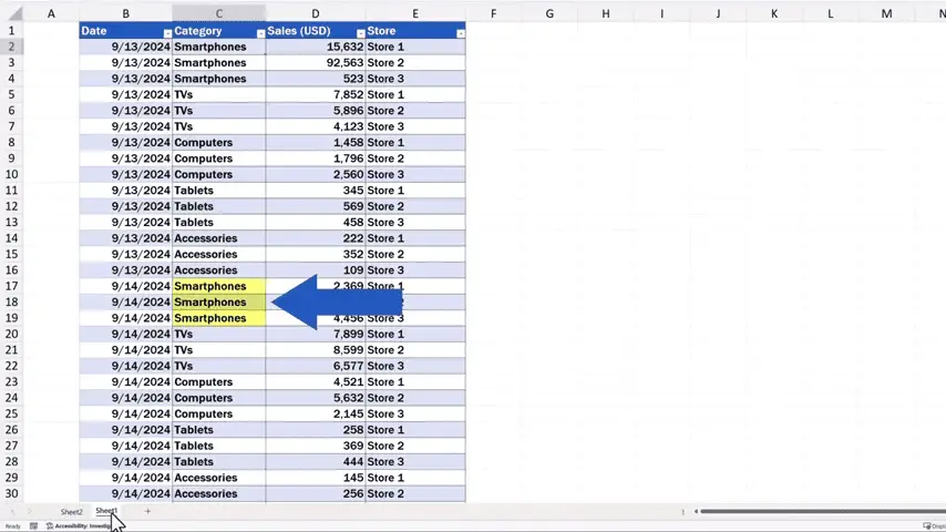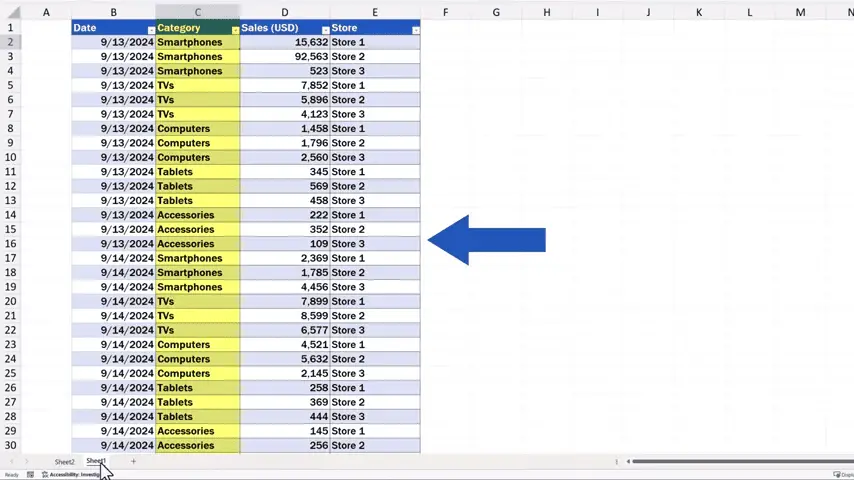 We can now sort and filter the sales data in these three stores based on, let’s say, ‘Category’.