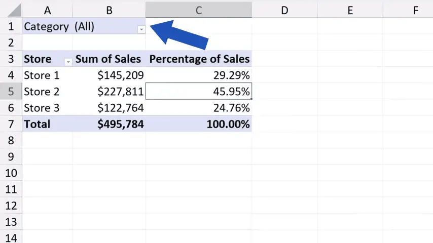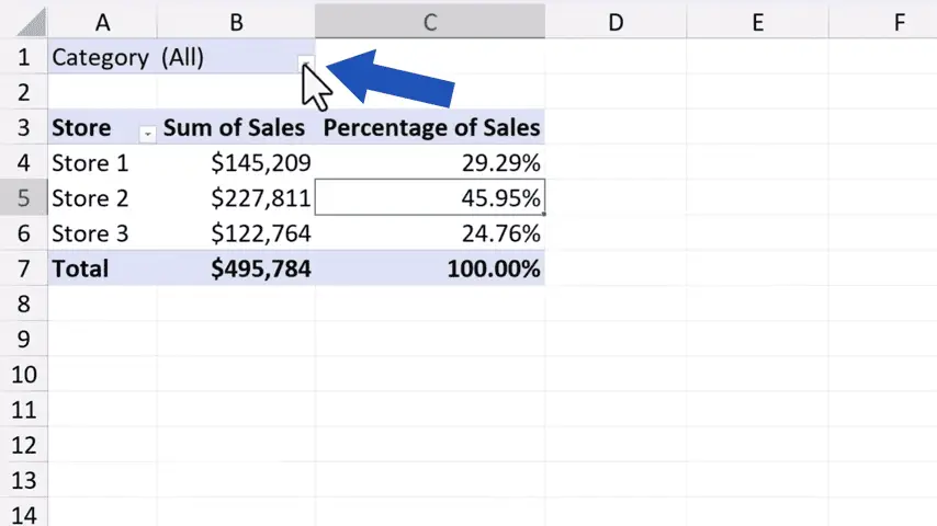 The option to filter the data by ‘Category’ has been inserted right above the pivot table.