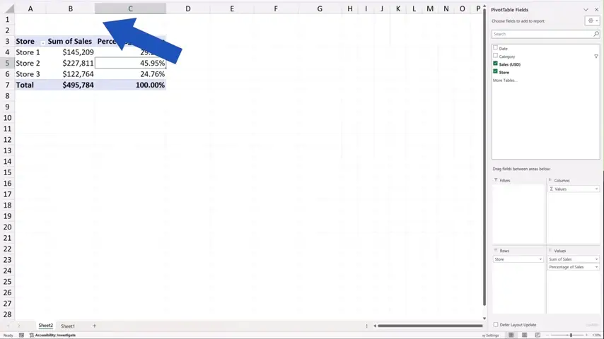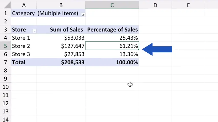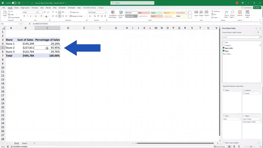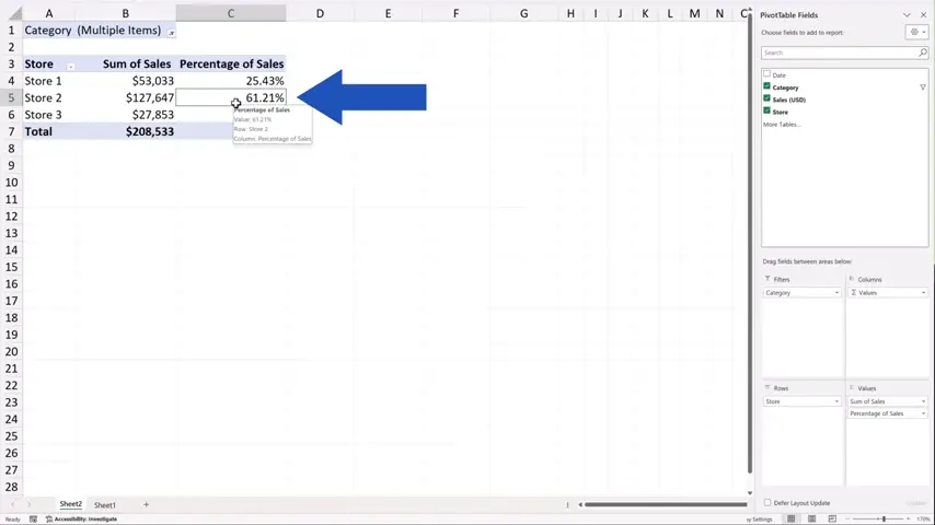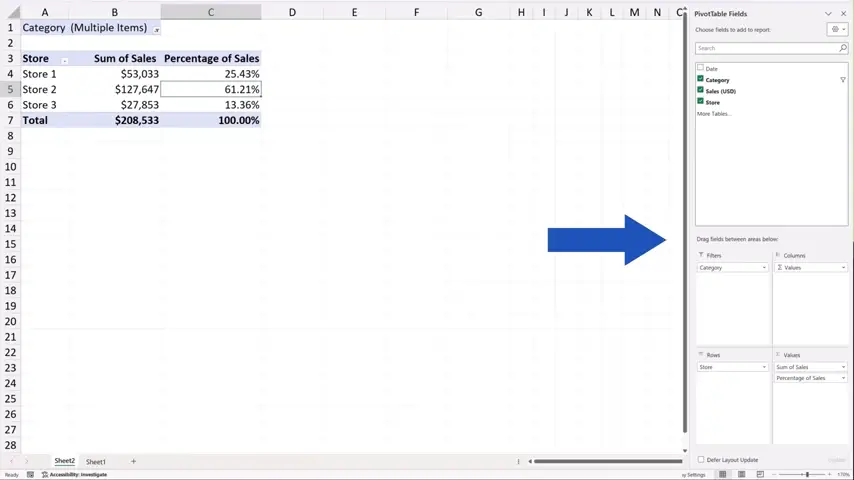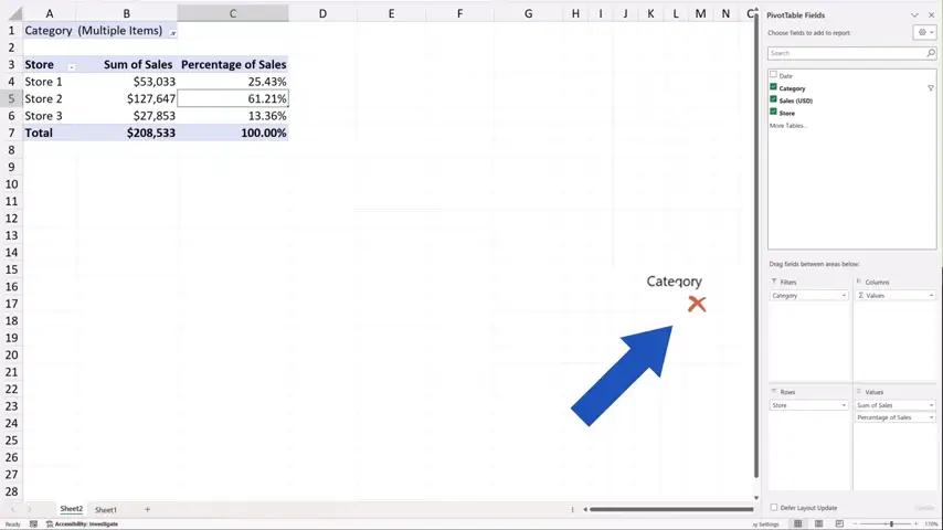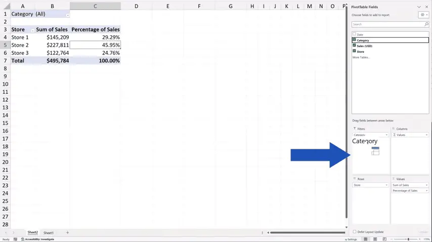 Let’s get back to Sheet2, where we see the pivot table and try to filter the data by ‘Category’.