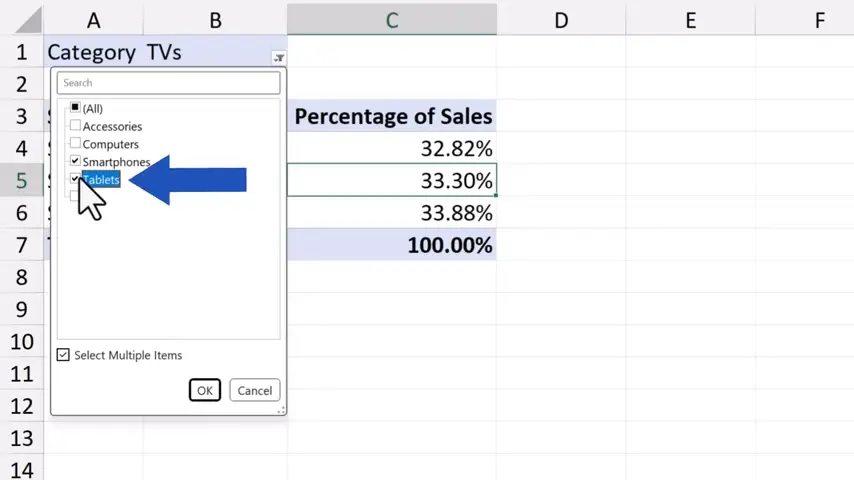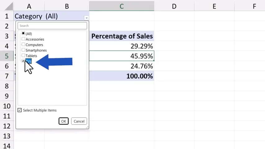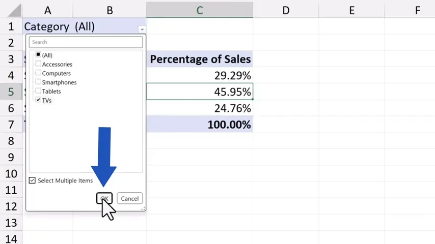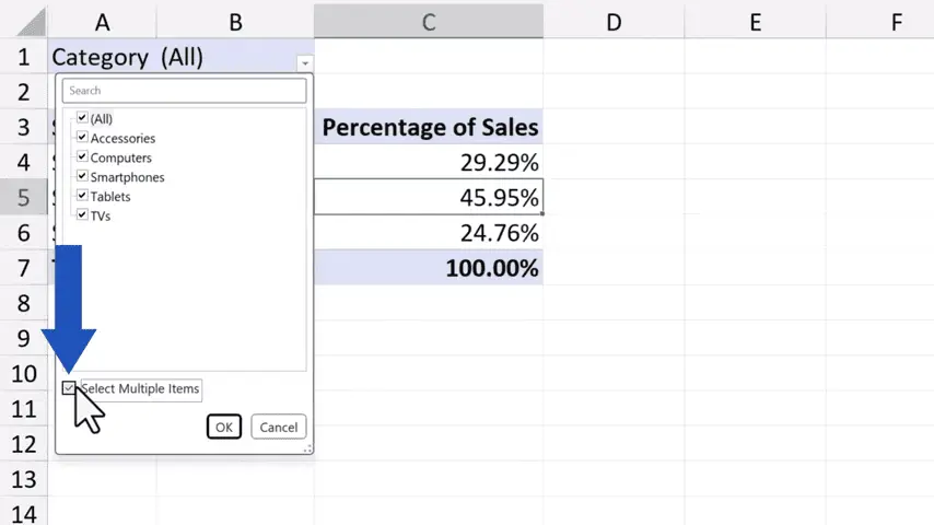 Tick the option ‘Select Multiple Items’ down here, we can quickly and conveniently filter the sales by any category from the list.