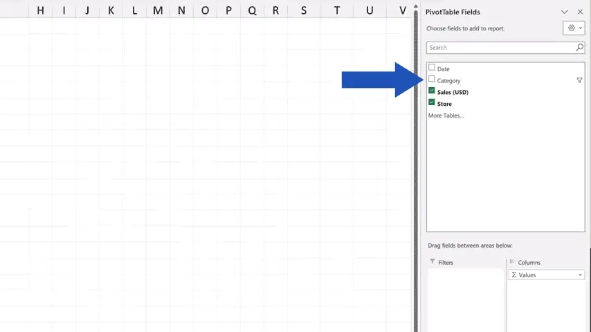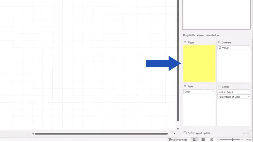 The section with ‘PivotTable Fields’ appears on the right, where we can find the area titled ‘Filters’.