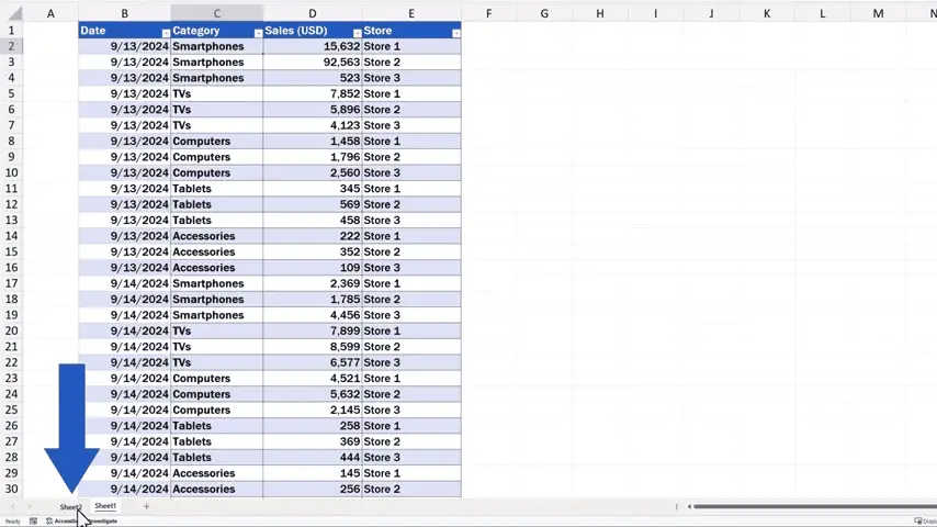 If we click on Sheet1, we can see the source data and all the available categories.