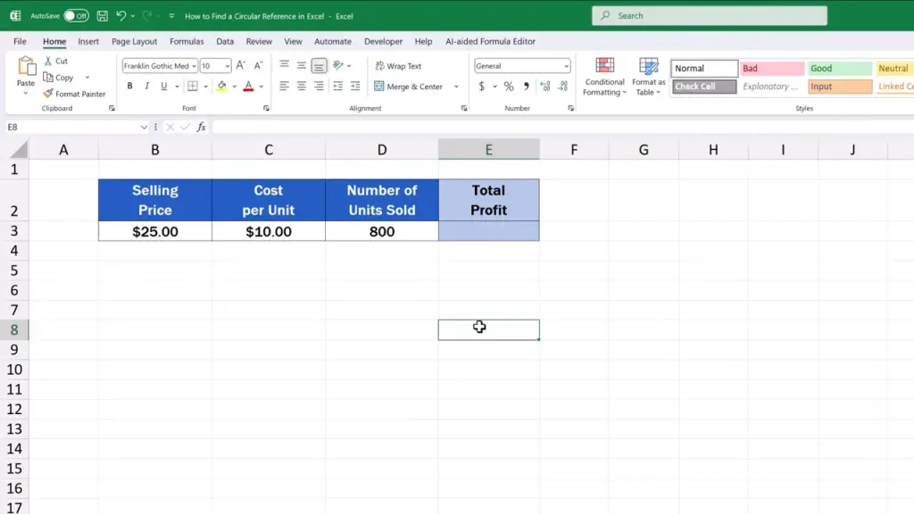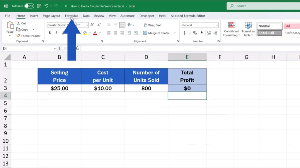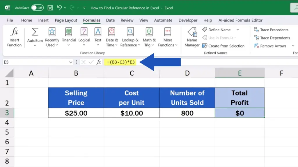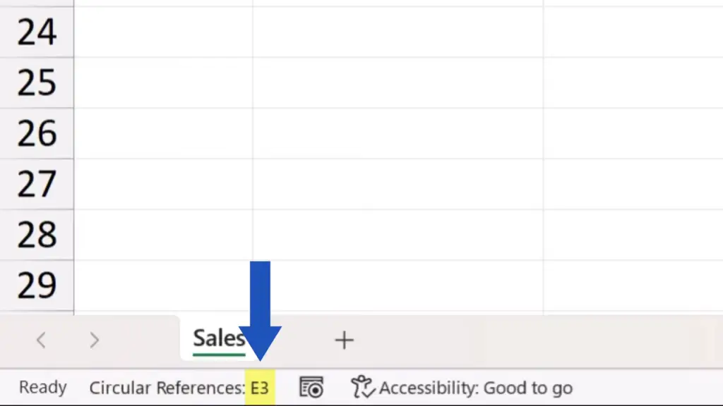 If you spot the notification ‘Circular References’, you’ll also see the exact cell where the issue’s occurred. In our case, E3 is the problem cell.