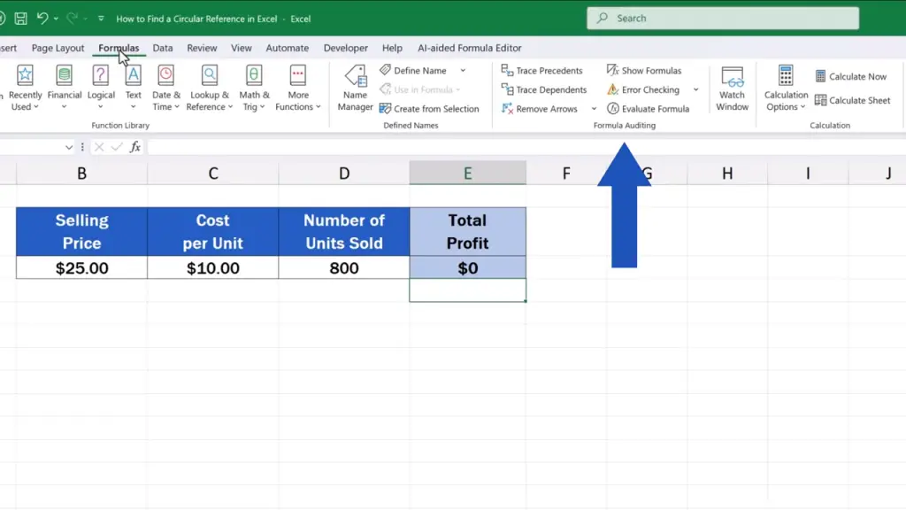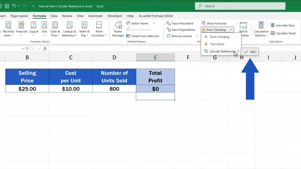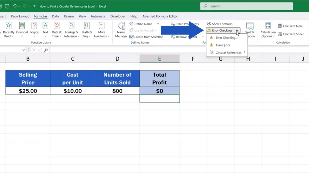 We navigate to the ‘Formulas’ tab, go to ‘Formula Auditing’, click on ‘Error Checking’ and all the way down here we find ‘Circular References’.