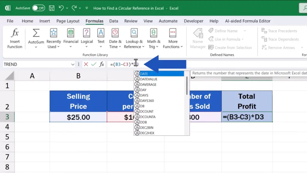 We check the entered formula thoroughly and, in our case it’s quite obvious, there’s an error in the ‘Total Profit’ formula – the reference to the cell E3 is wrong and we need to change that part to ‘D3’.