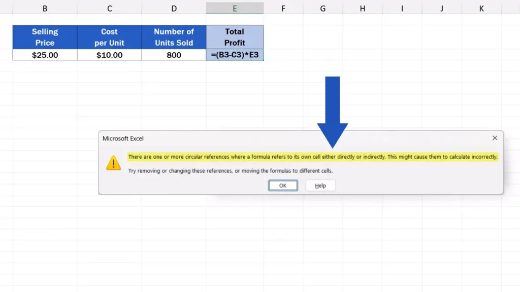 Immediately when the problem’s been detected, Excel shows this error message that states that the formula contains a circular reference. Of course, circular references usually happen with much more complicated calculations. Here, we’re using a very simple example for clarity.