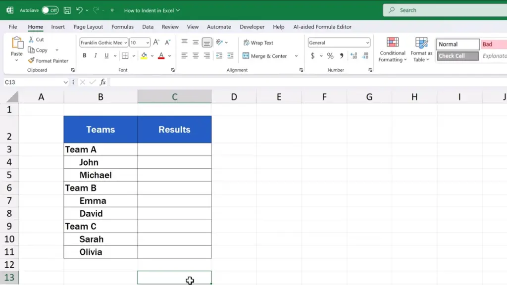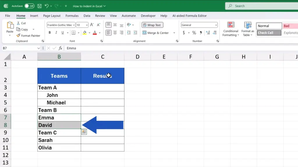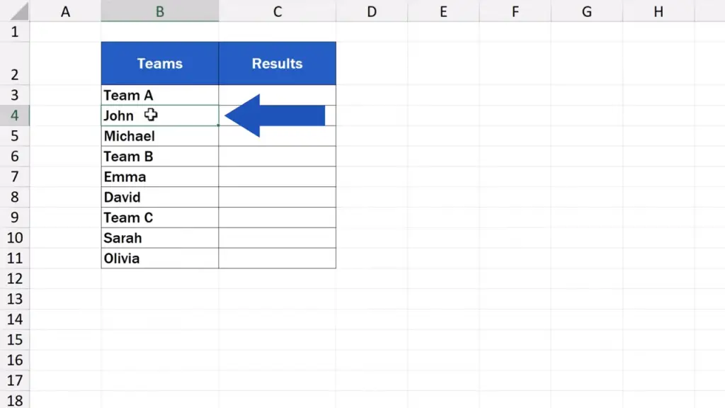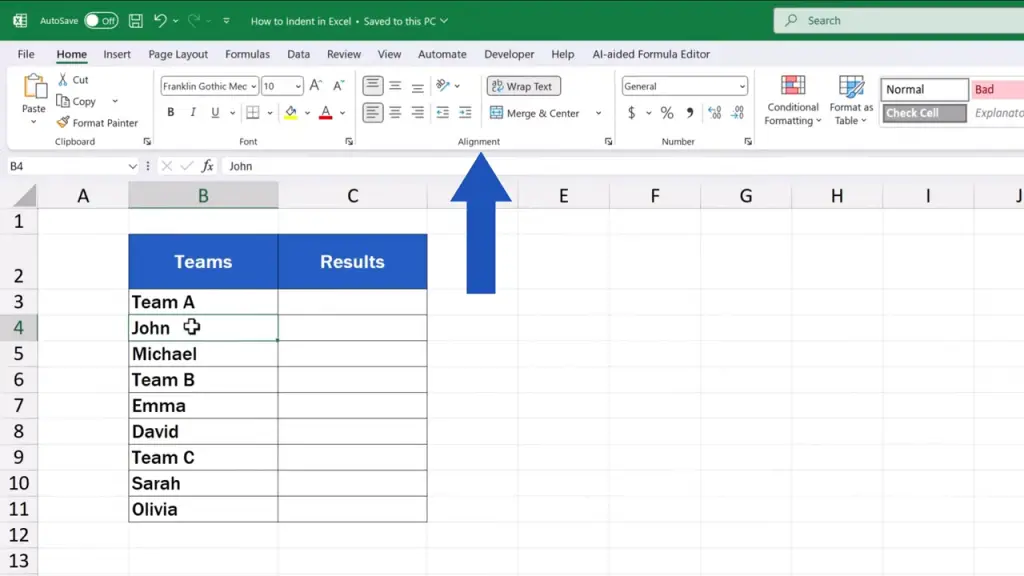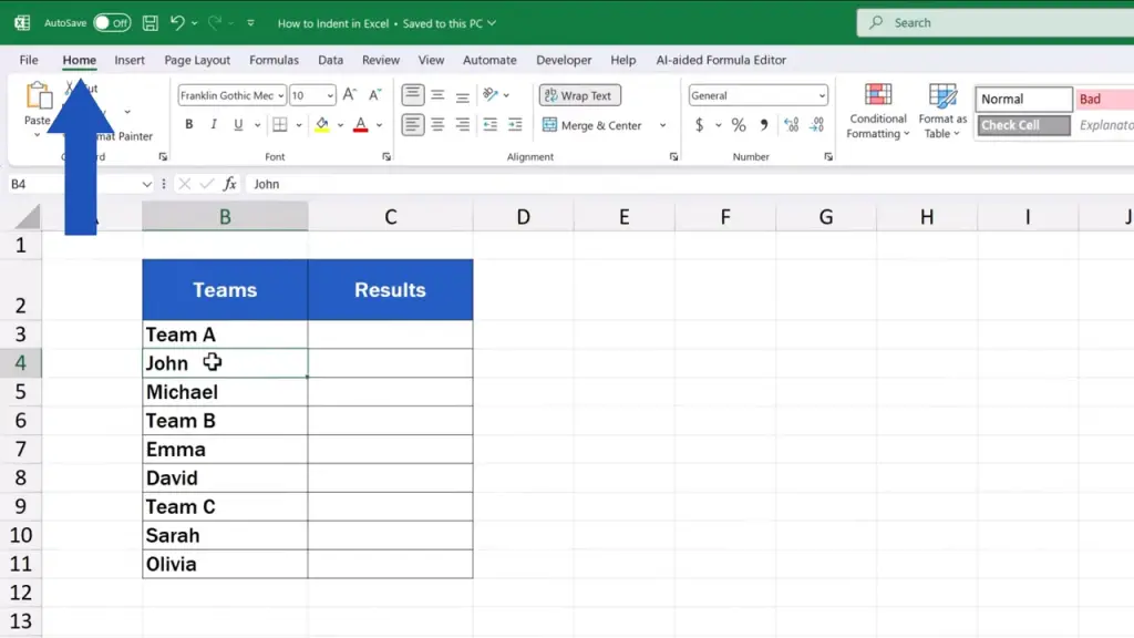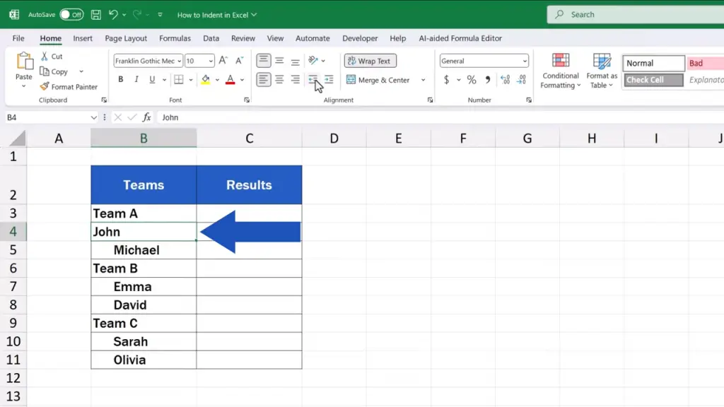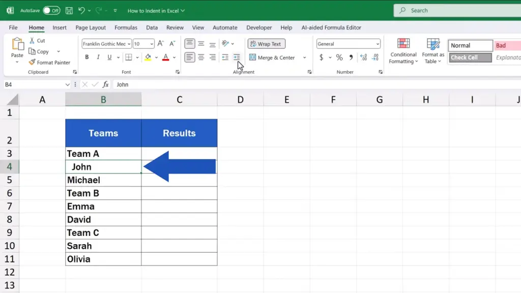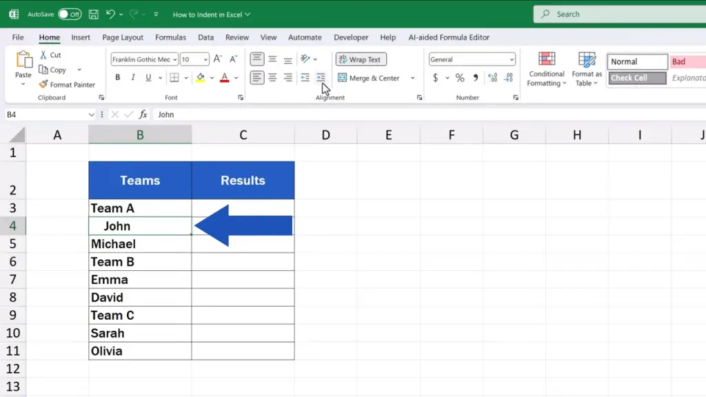 To indent text in Excel, we begin by clicking on the cell we want to alter. Let’s click on the cell B4, which contains the name ‘John’ from Team A.
