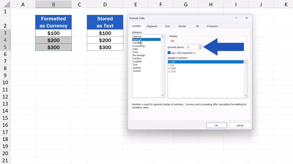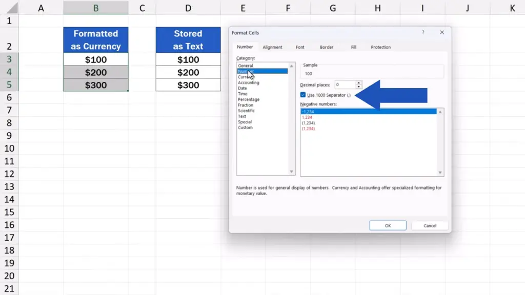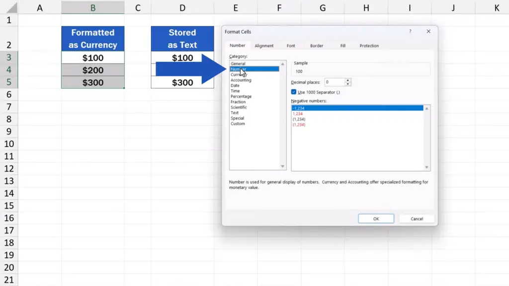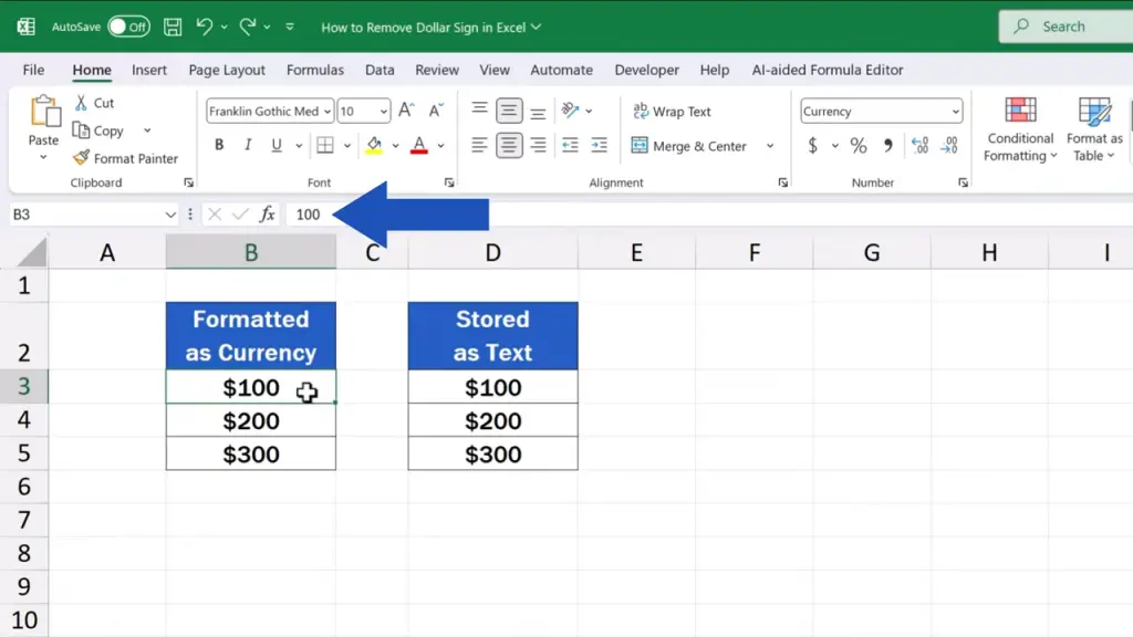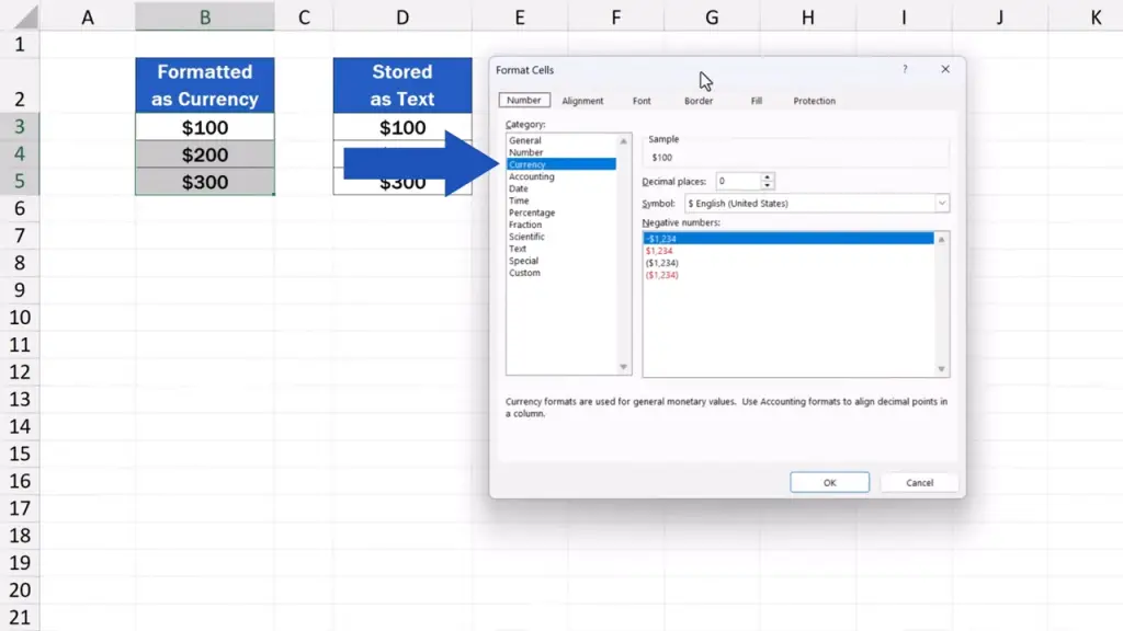 That means the dollar sign here is not part of the value stored in the cell – it’s part of the formatting.