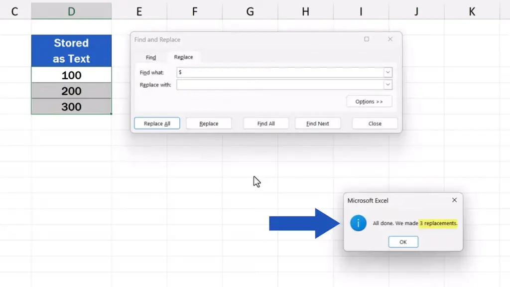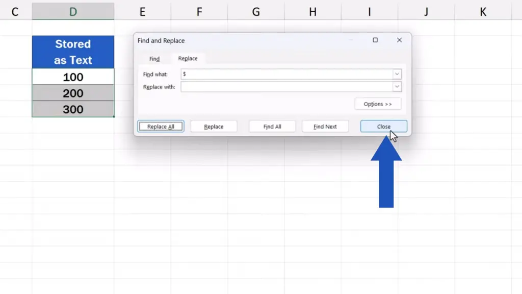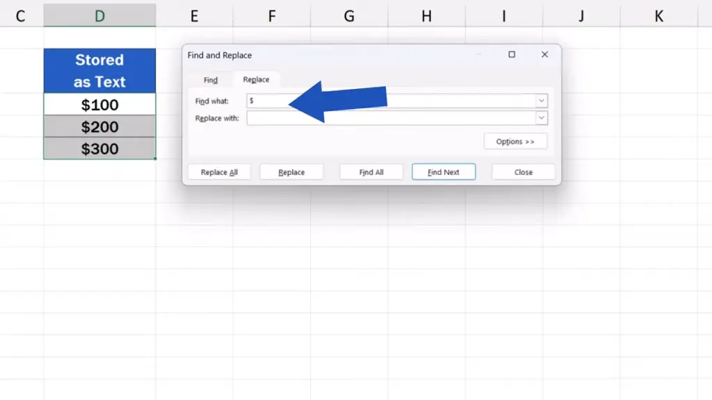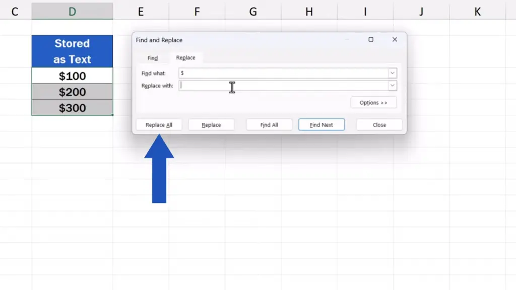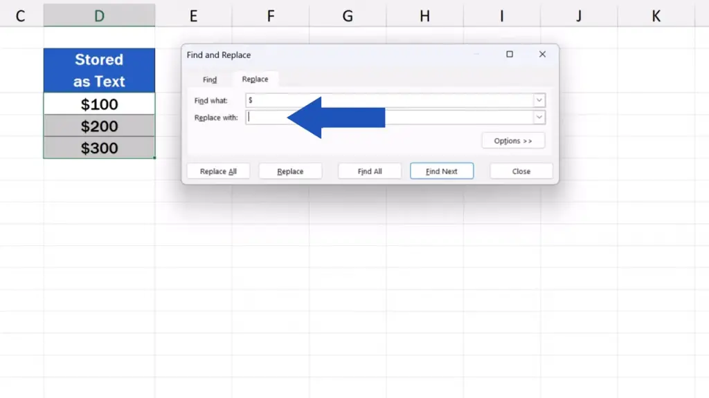 The box ‘Replace with’ remains empty, since we want to find all occurrences of the dollar sign in the selected range of cells and remove them without any replacement.
