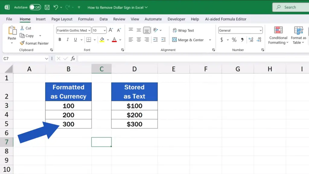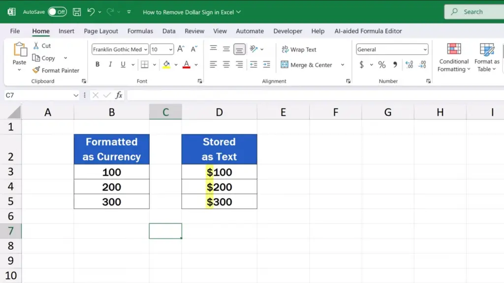 To remove the dollar sign when used with a number in Excel, we first need to find out whether this symbol shows in the cell because it’s part of its formatting or whether it’s been manually entered next to the number as text.
