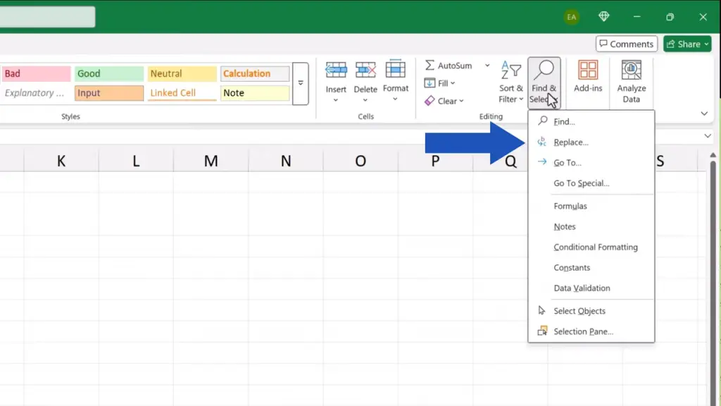 And then click on ‘Replace’ for the ‘Find & Replace’ window to appear.
