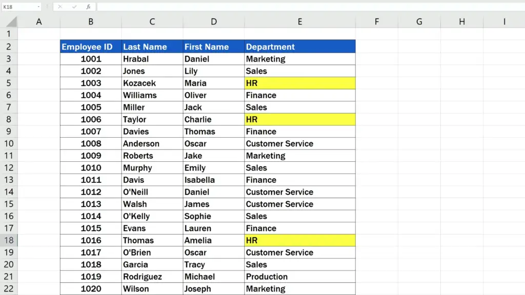 Now, there’s one thing to watch out for. Excel goes through each and every occurrence of the phrase within the data table. The problem is that the table might contain the letters ‘HR’ as part of other words and in such cases, we don’t want to replace them.