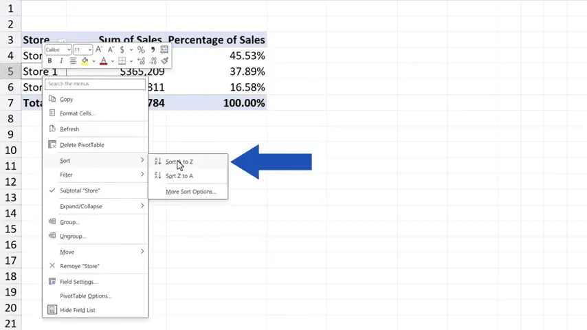 The same way to simply sort data works not only with numbers but with text, too. Let’s click into the column ‘Store’, right-click again, click on ‘Sort’ and choose the option ‘A to Z’. And here we go! All done!